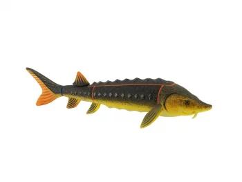 Макет представляет собой уменьшенную модель осетра с окраской, максимально приближенной к естественной, как снаружи, так и при разделении на составные части.