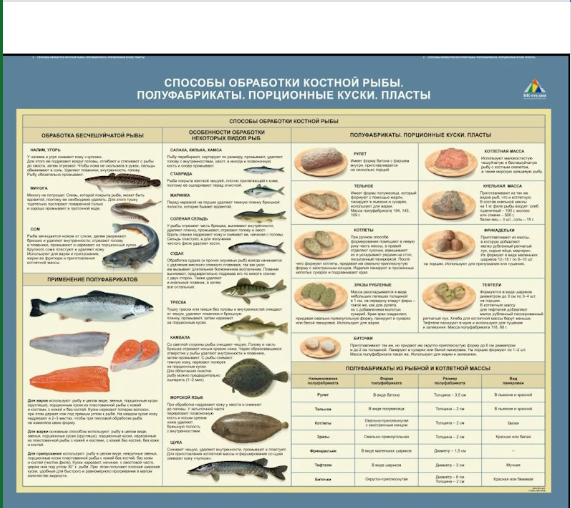 Стенд также демонстрирует текстовые описания и иллюстрации следующих полуфабрикатов, порционных кусков и пластов. В табличной форме представлена информация о полуфабрикатах из рыбной и котлетной массы.