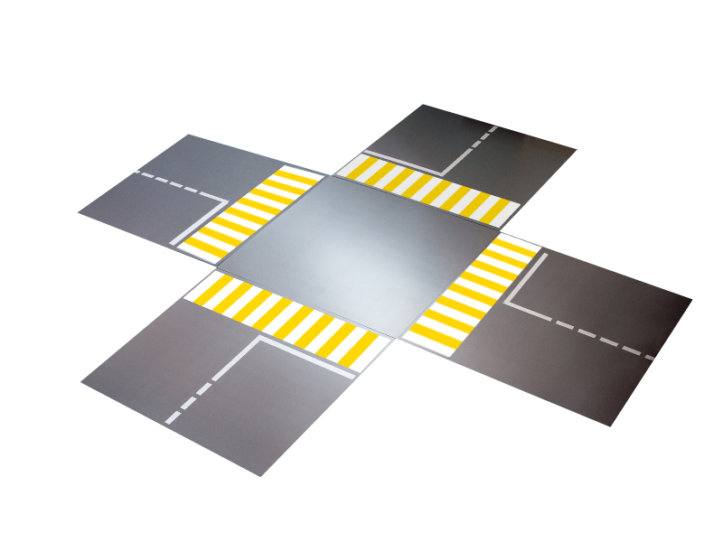 Четырехсторонний перекресток представляет собой демонстрационную модель перекрестка, состоящую из пяти секций, на которых изображена проезжая часть с линиями дорожной разметки и пешеходными переходами.