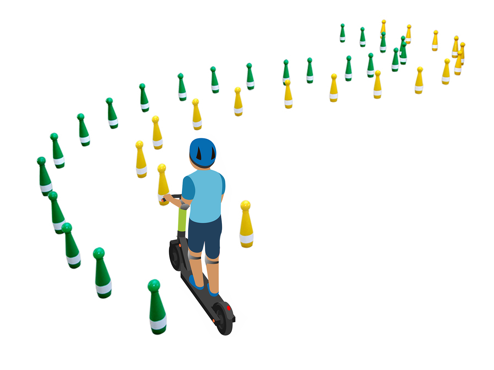 Предназначен для отработки навыков точного маневрирования на средстве индивидуальной мобильности (СИМ) по извилистой траектории с плавными поворотами, что формирует устойчивое и безопасное поведение на дороге.