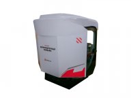 Автотренажер оснащен сборно-разборным панорамным проекционным экраном с углом обзора 210 градусов и двумя мультимедиапроекторами, предназначенными для визуализации практических упражнений.