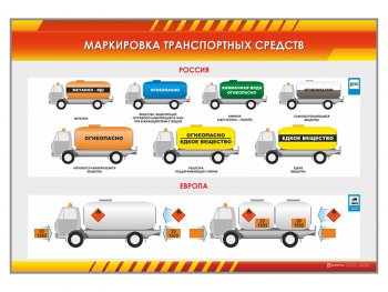 Стенд представляет собой информационную панель, на которой размещены сведения о маркировке транспортных средств с опасными грузами.