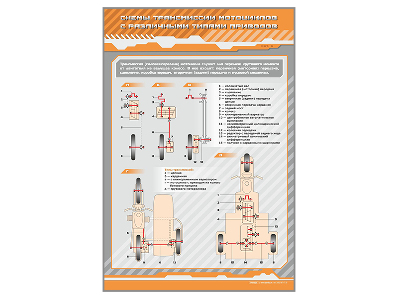 Стенд представляет собой информационную панель, на которой размещены сведения о схемах трансмиссии мотоциклов с различными типами приводов.