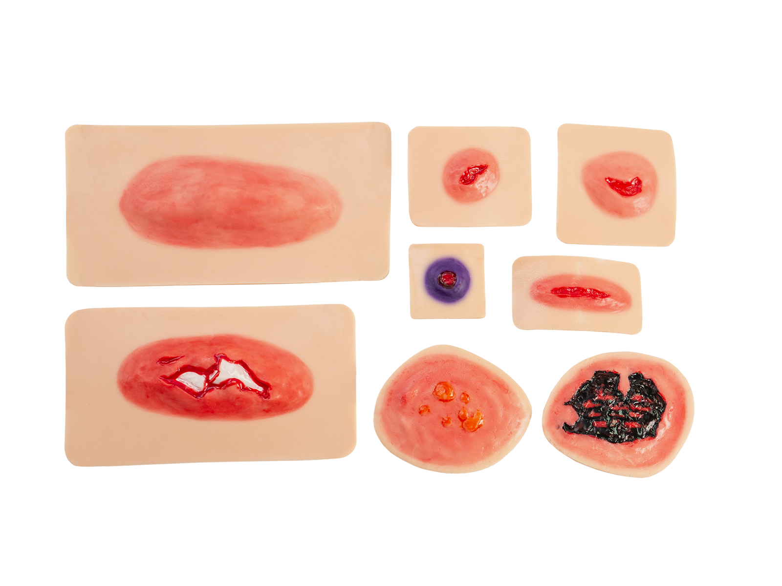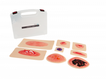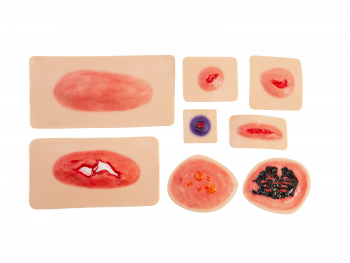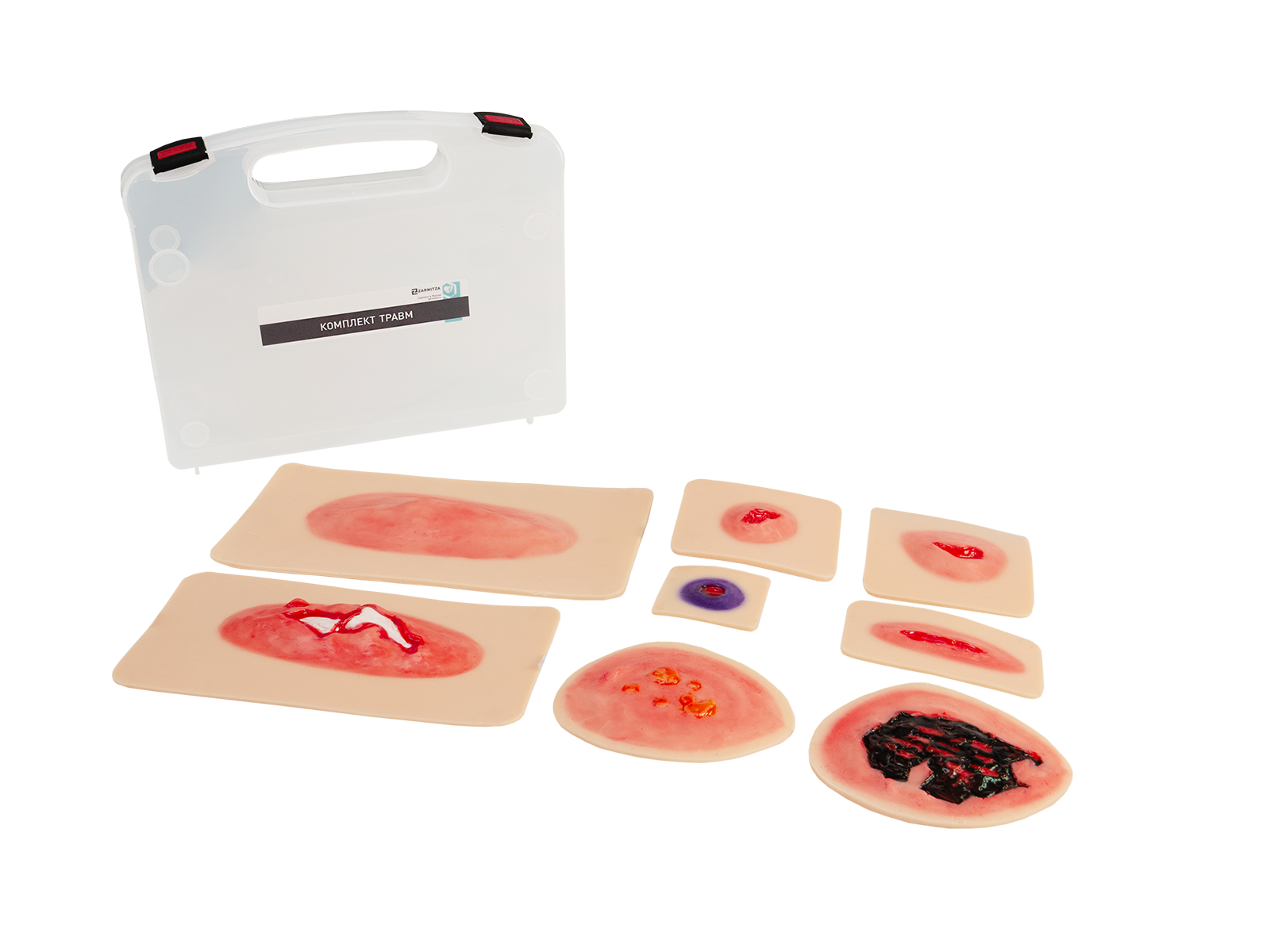 Комплект накладных травм - это профессиональный учебный инструмент, предназначенный для моделирования различных видов повреждений кожных покровов. Комплект включает восемь реалистичных съемных моделей, имитирующих рваную, резаную, колотую раны, открытый и закрытый переломы, огнестрельное повреждение, а также ожоги разной степени тяжести.