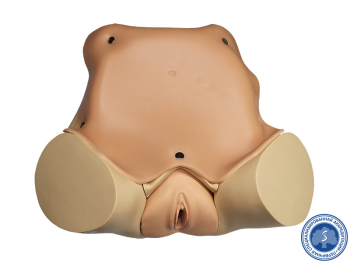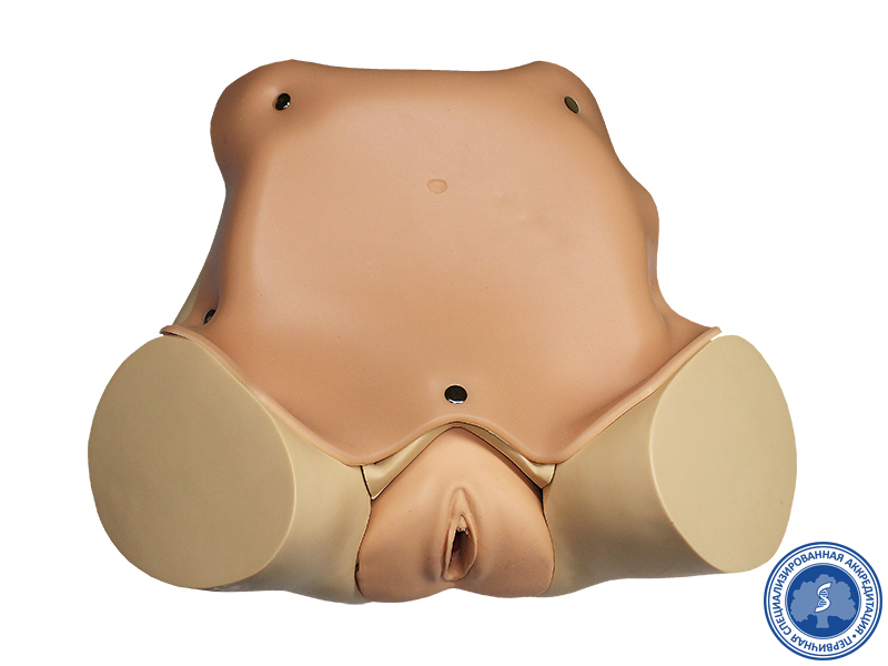 Тренажер представляет собой анатомическую модель нижней части туловища женщины с верхними фрагментами нижних конечностей. Воспроизведен рельеф промежности, обеспечено естественное значение физикальных свойств моделей органов. Сменные материалы, устанавливаемые на платформу, выполнены из силикона, имитирующего ткань человеческого тела.