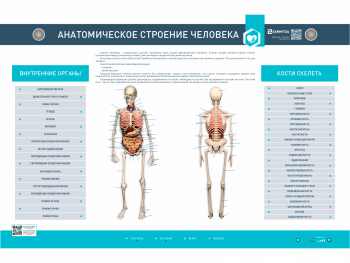 Электрифицированный стенд-тренажер представляет собой информационную панель с раздельной светодиодной индикацией и коммутируемую с ним интерактивную анатомическую модель скелета человека. На стенде-тренажере изображено строение внутренних органов, костей скелета (вид спереди и сзади). В конструкцию учебного оборудования интегрированы высокочувствительные сенсоры для управления стендом при помощи интерактивного воздействия приемо-передающих устройств. В черепную коробку модели скелета встроена система голосового сопровождения.