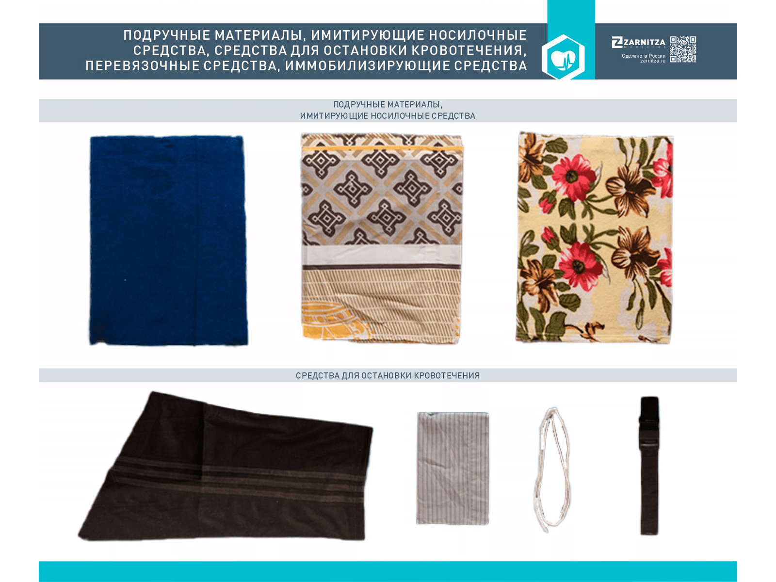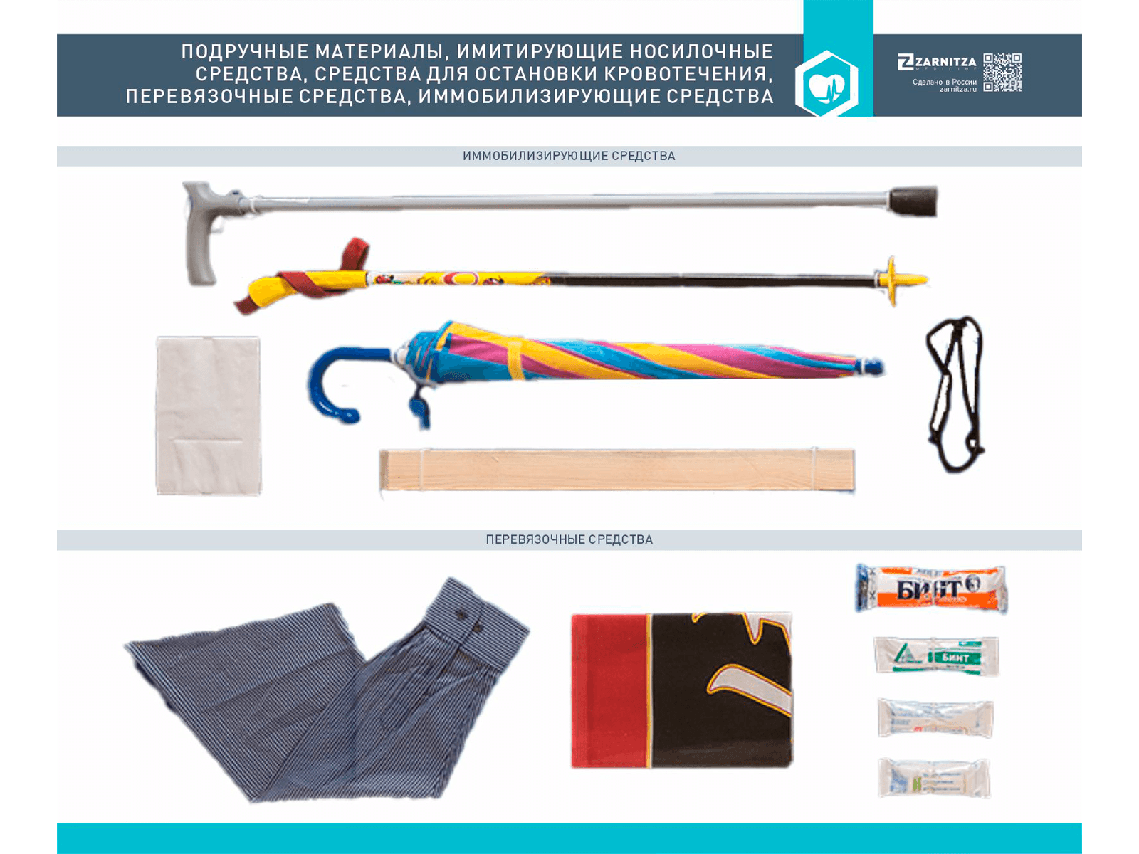 Стенды представляют собой информационные панели, на которых размещены образцы подручных материалов для оказания первой помощи, транспортировки и иммобилизации.