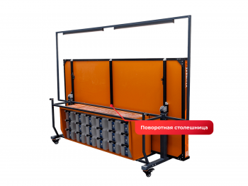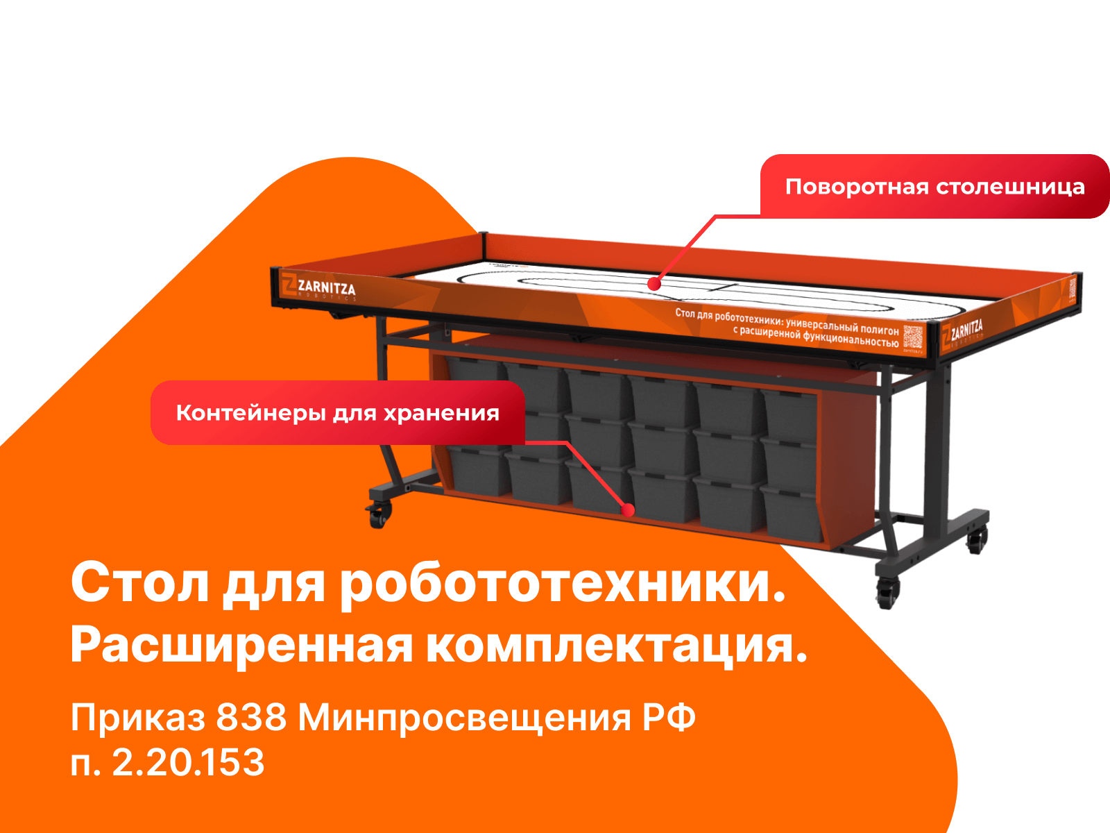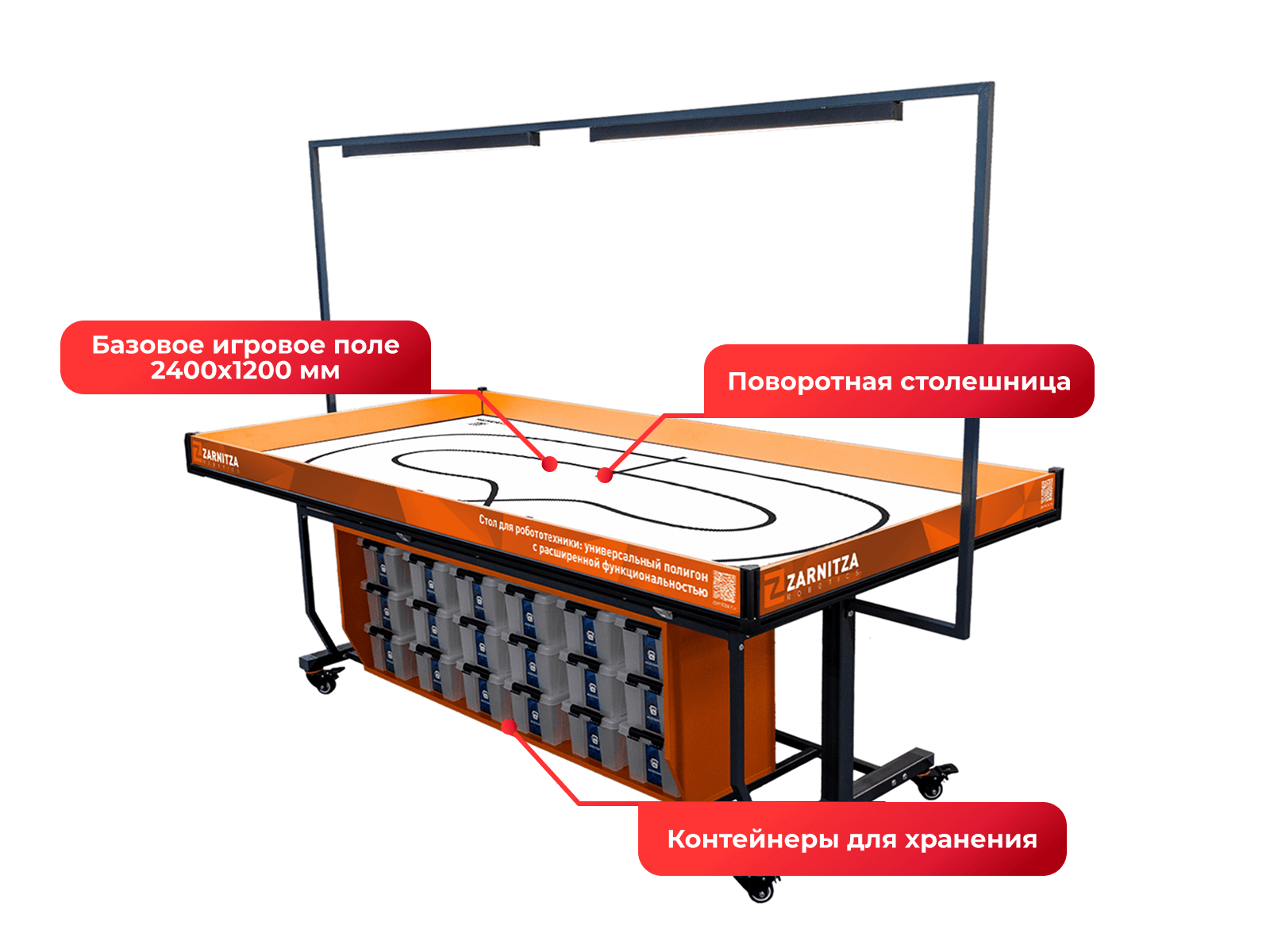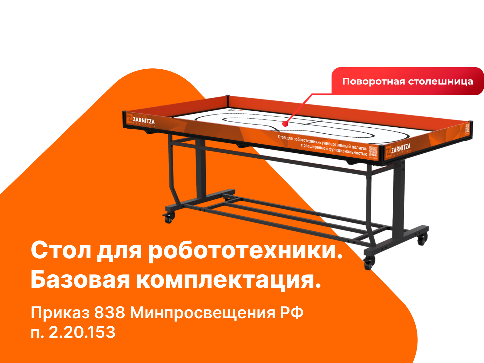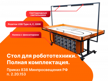 Профессиональное оборудование для подготовки и проведения соревнований по робототехнике. Стол представляет собой полигон для мобильных роботов, размеры игрового поля которого (2400×1200 мм) соответствуют стандартам тренировочных полей World Robot Olympiad (WRO) — международных соревнований по робототехнике. Стол имеет поворотную поверхность, которая может быть зафиксирована в вертикальном положении для уменьшения занимаемого пространства, если оборудование не используется. Соответствует требованиям приказа Минпросвещения РФ № 838.