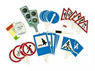 Описание: набор миниатюрных дорожных знаков и автомобилей с магнитным основанием. Это решение помогает учителям демонстрировать правила дорожного движения.