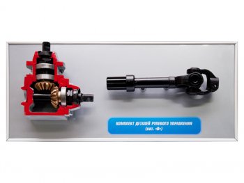 Учебное оборудование представляет собой комплект деталей рулевого управления транспортного средства категории "D", в состав которого входит рулевой механизм в разрезе.