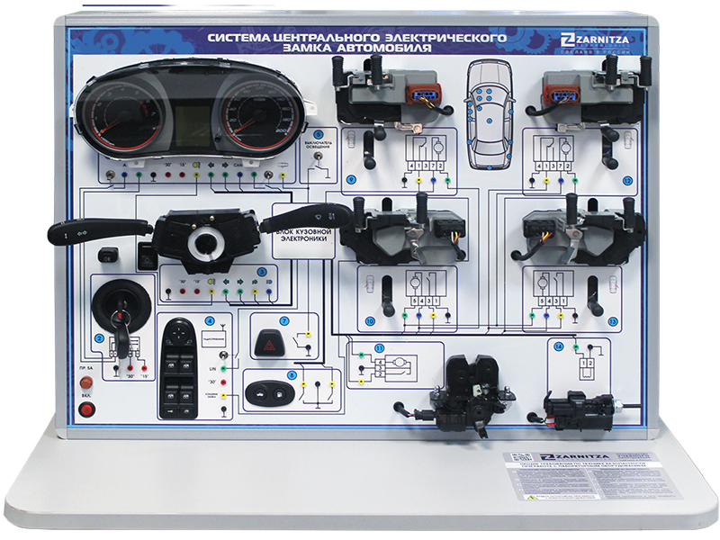 Комплект учебно-лабораторного оборудования "Система центрального электрического замка автомобиля" предназначен для проведения лабораторно-практических занятий по направлениям "Устройство автомобильной техники", "Эксплуатация автомобильной техники", "Конструкция и расчет автомобильной техники", для обеспечения наглядного изучения устройства, принципа работы электрических составляющих центрального замка автомобиля.