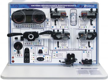 Стенд выполнен в настольном моноблочном исполнении и включает в себя действующую систему центрального замка автомобиля с обменом по шине CAN, LIN между блоками, обеспечивающую полное функционирование системы открывания/запирания замков, постановки и снятия автомобиля на охрану. Стенд обеспечивает изучение процедуры переобучения рабочих ключей системы, внесение неисправностей в работу системы, изучение системы управления освещением автомобиля с бортовой CAN шиной.