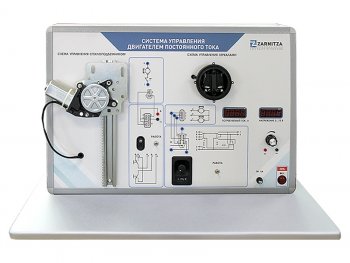 Комплект учебно-лабораторного оборудования представляет собой действующий макет, имитирующий работу приводов постоянного тока во всем диапазоне питающего напряжения бортовой сети автомобиля. На лицевую панель модуля нанесена мнемосхема системы управления моторами, обозначены контрольные точки.