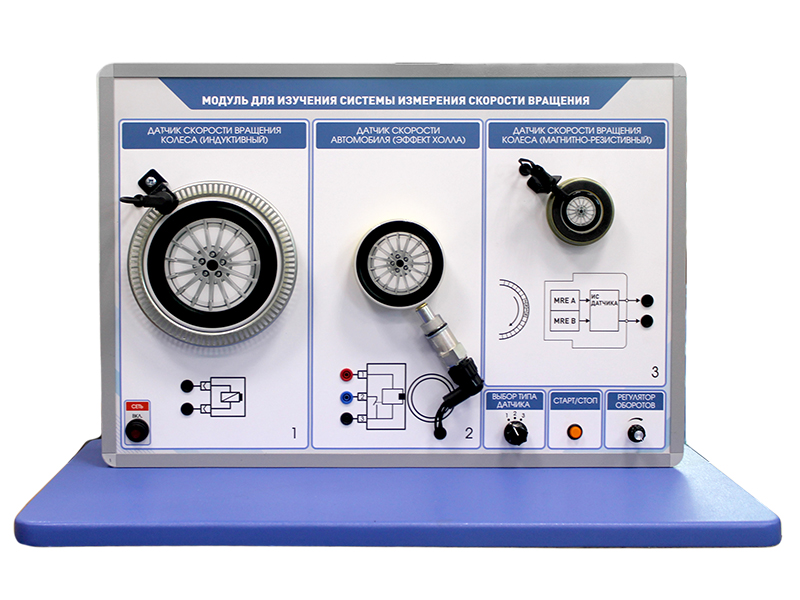 - Модуль для изучения системы измерения скорости вращения. Позволяет изучить датчик скорости вращения колес (ABS-EBS) (индуктивный при наличии "меток"), датчик скорости движения автомобиля (эффект Холла) и датчик скорости вращения колеса ABS (магнитно-резистивный).