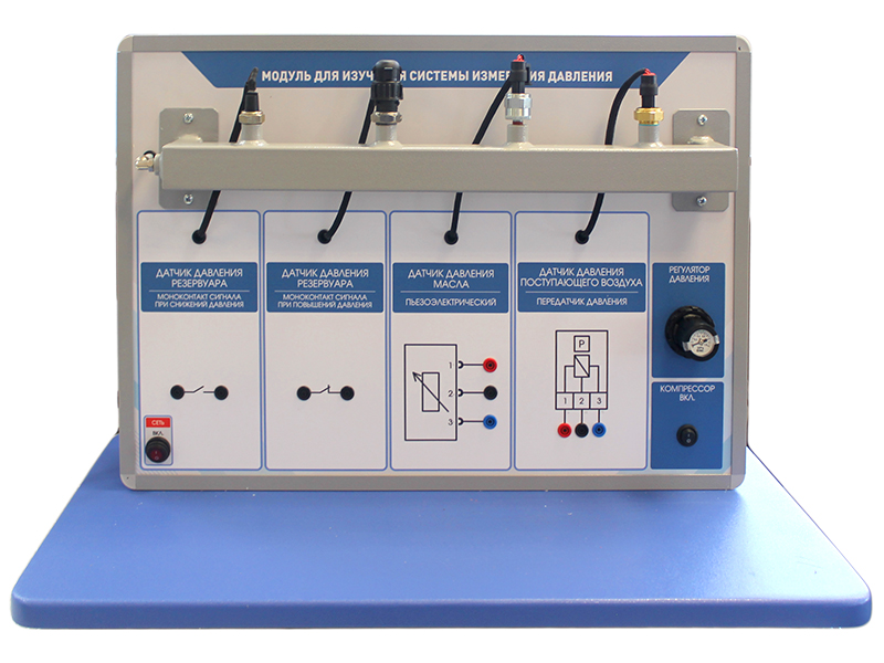 - Модуль для изучения системы измерения давления. Позволяет изучать датчик давления резервуара (моноконтакт сигнала при снижении), датчик давления (моноконтакт сигнала при повышении), датчик давления поступающего воздуха (передатчик давления) и датчик давления масла (пьезоэлектрический).