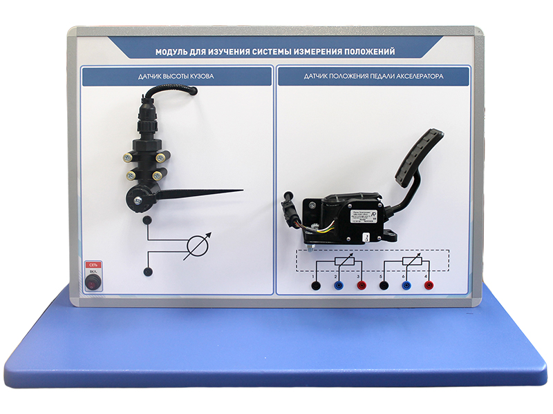 - Модуль для изучения системы измерения положений. Позволяет изучать датчик положения педали акселератора (угловой потенциометр) и датчик высоты кузова (индуктивный).