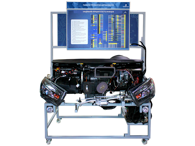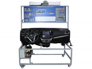 Комплект учебно-лабораторного оборудования "Панели приборов автомобиля" представляет собой действующую систему освещения и сигнализации автомобиля с оригинальными деталями. Стенд выполнен в виде рамной конструкции, на которой установлены органы управления, коммутации, индикации, а также демонстрационные образцы, объединенные в функциональные блоки. В качестве демонстрационных образцов на стенде представлены: блок-фары, повторители поворота, фонари, блок управления освещением, приборная панель, плафон освещения салона, подрулевой переключатель, замок зажигания, монтажный блок, выключатель аварийной сигнализации и т.п.