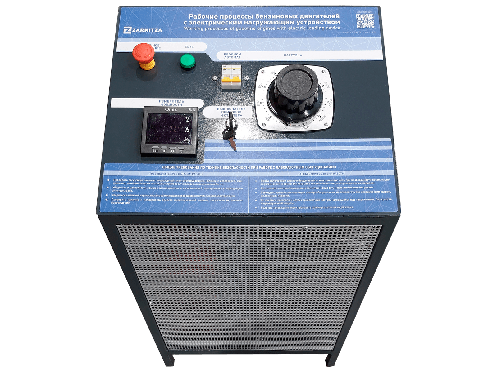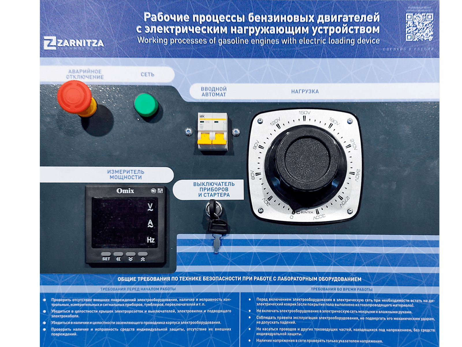 Лабораторный стенд представляет собой одноцилиндровую бензиновую генераторную установку, оснащенную утилизатором электрической энергии, вырабатываемой генератором, и стола управления с устройством ввода-вывода и обработки данных. Двигатель оборудован системой датчиков, в том числе и датчиком крутящего момента, подключенных через контроллер к ноутбуку.