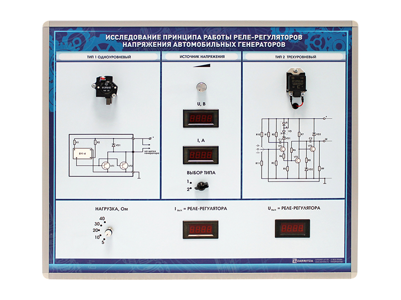 Лабораторный стенд-тренажер представляет собой моноблок с размещенными на нем регуляторами напряжения, приборами контроля и индикации, мнемосхемами регуляторов напряжения. Стенд-тренажер позволяет изучить принцип работы двух видов реле-регуляторов напряжения, обеспечивает возможность наблюдения зависимости напряжения возбуждения генератора от вырабатываемого тока, а также выходного напряжения от тока обмотки возбуждения.
