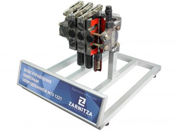 Представляет собой блок управления навесным оборудованием МТЗ-1221 в разрезе, установленный на металлическую раму. Линии разрезов для наглядности окрашены красной краской.