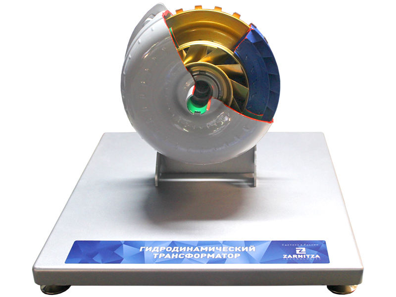 Учебное оборудование представляет собой модель гидродинамического трансформатора в сборе, с разрезами основных узлов и деталей, в настольном исполнении.