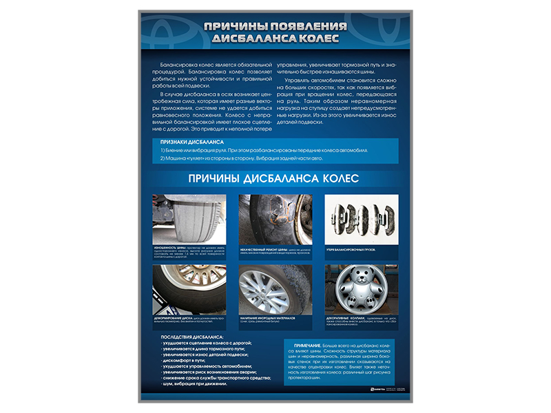 Стенд представляет собой информационную панель с иллюстрированной информацией о видах дисбаланса колес и возможных причинах их появления.