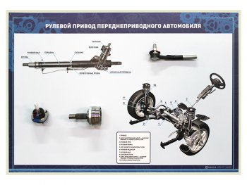 Стенд представляет собой информационную панель, на которой размещены разрезные агрегаты и сведения о рулевом управлении переднеприводного автомобиля.