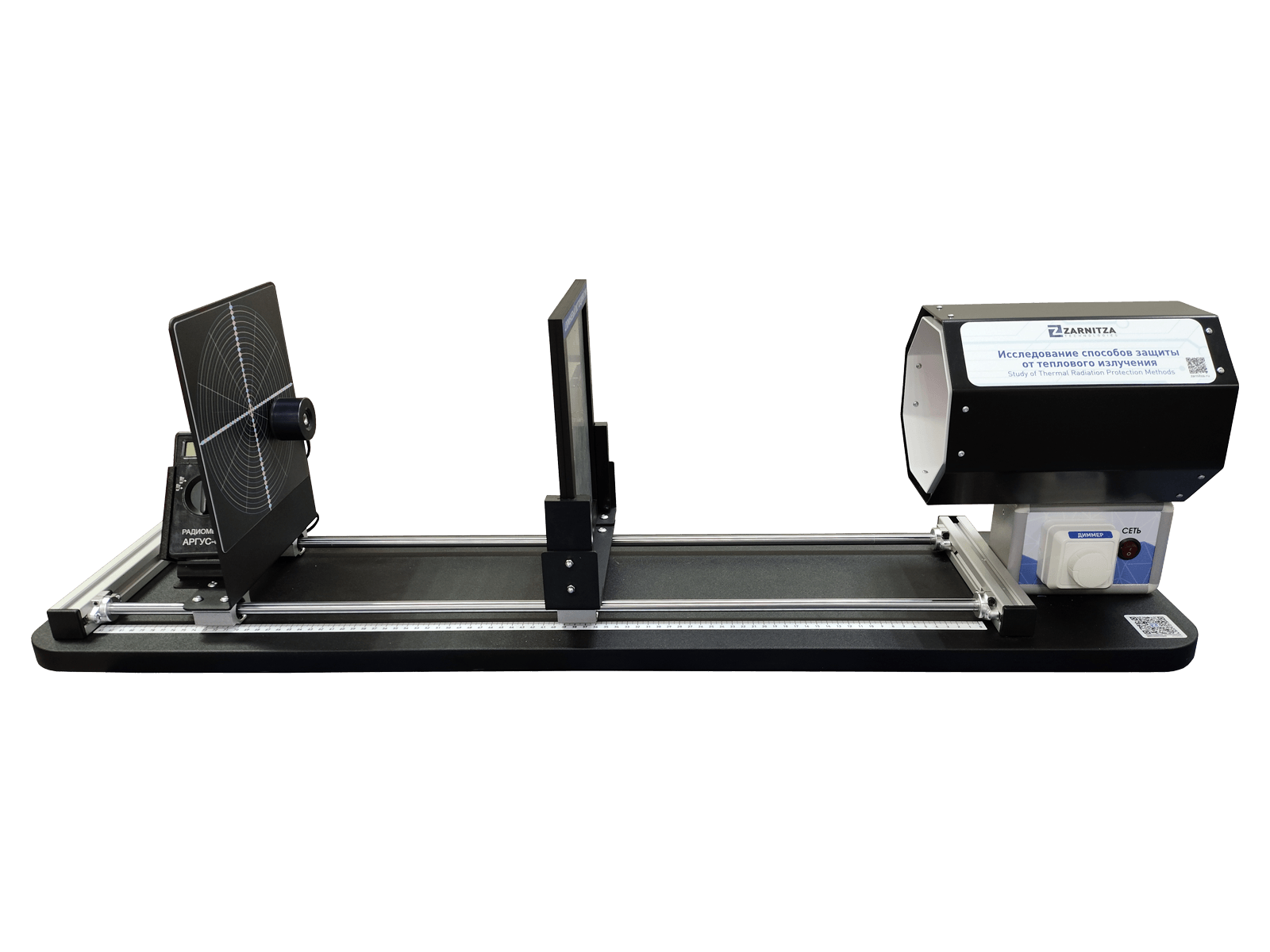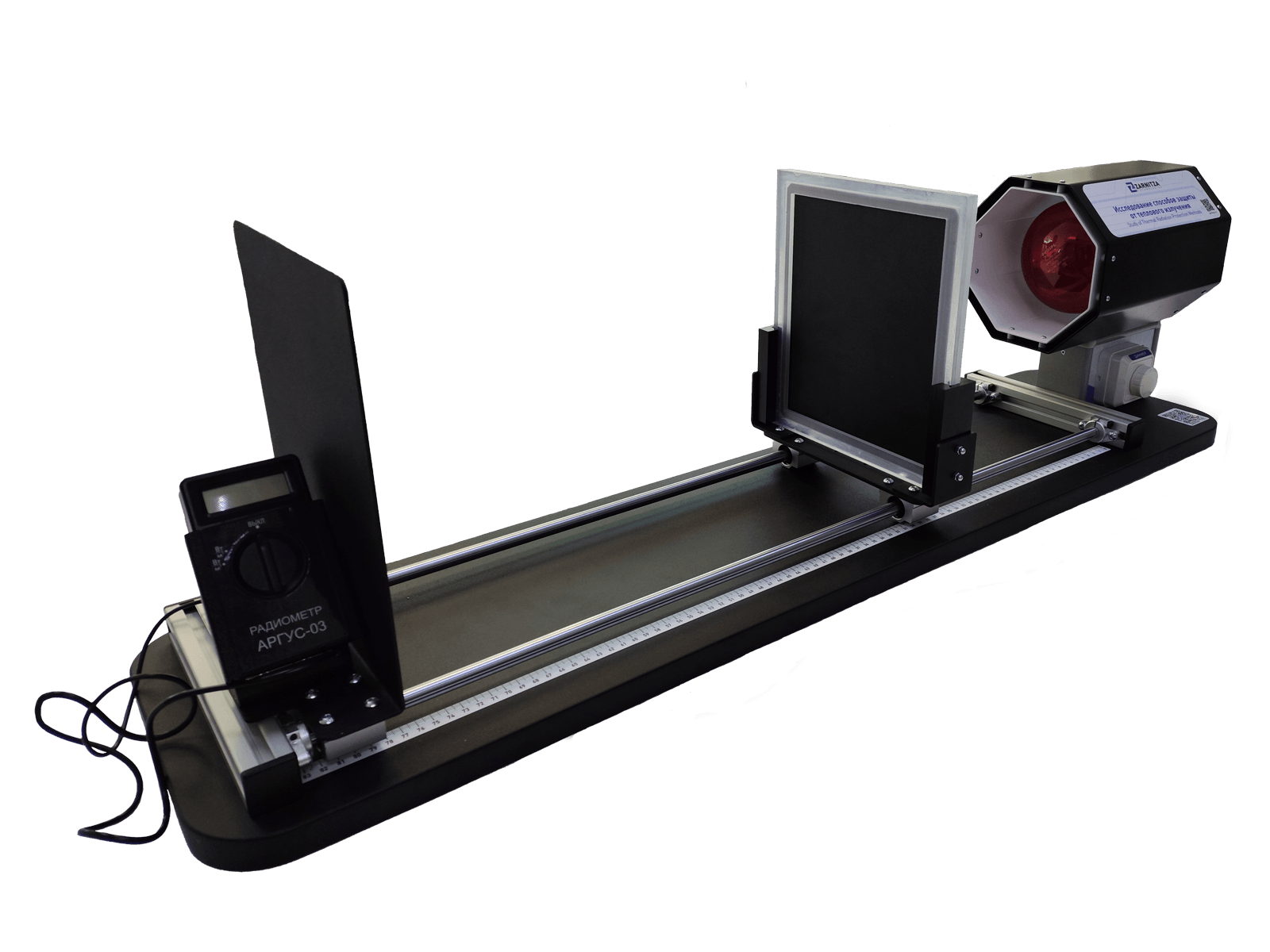 Комплект учебно-лабораторного оборудования "Исследование способов защиты от теплового излучения" (далее стенд) предназначен для проведения экспериментальных исследований по измерению интенсивности тепловых излучений в зависимости от расстояния до источника, распределение интенсивности по вертикали и горизонтали.