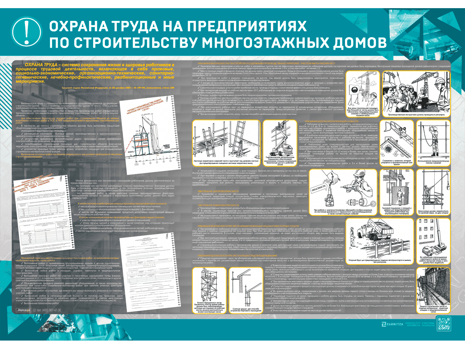Стенд представляет собой панель, на которой размещена информация об охране труда на предприятиях по строительству многоэтажных домов.