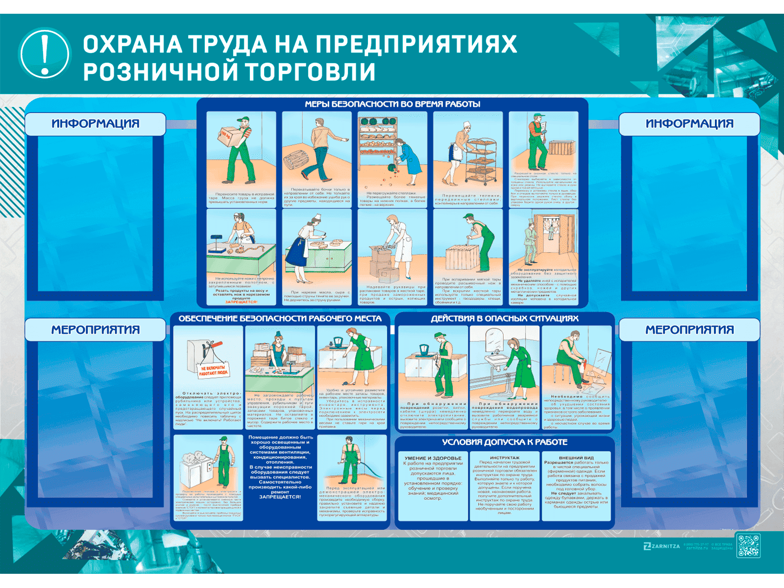 Стенд-уголок предназначен для наглядного отображения информации об обеспечении и мерах безопасности рабочего процесса и рабочего места, условиях допуска к работе, правилах поведения и порядке действий в опасных ситуациях в условиях предприятий розничной торговли, а также для формирования у сотрудников осознанного отношения к вопросам охраны труда.