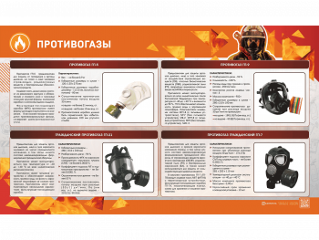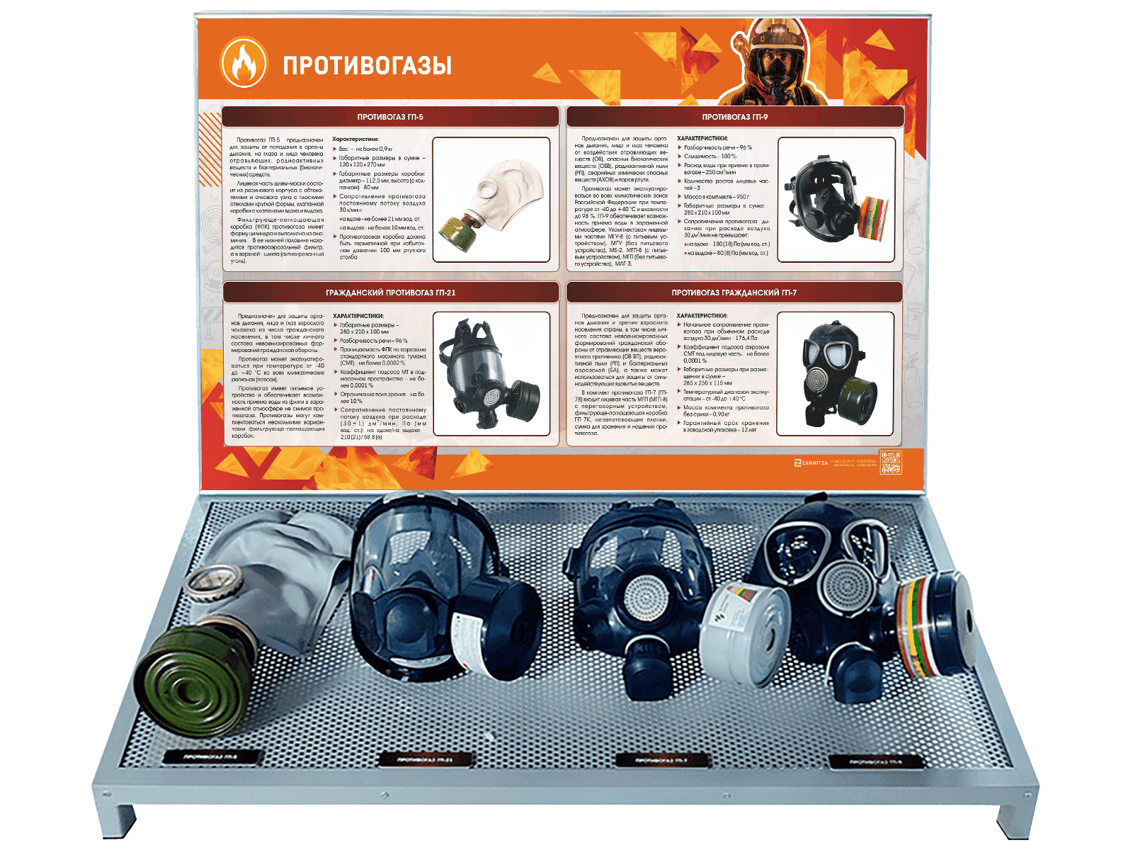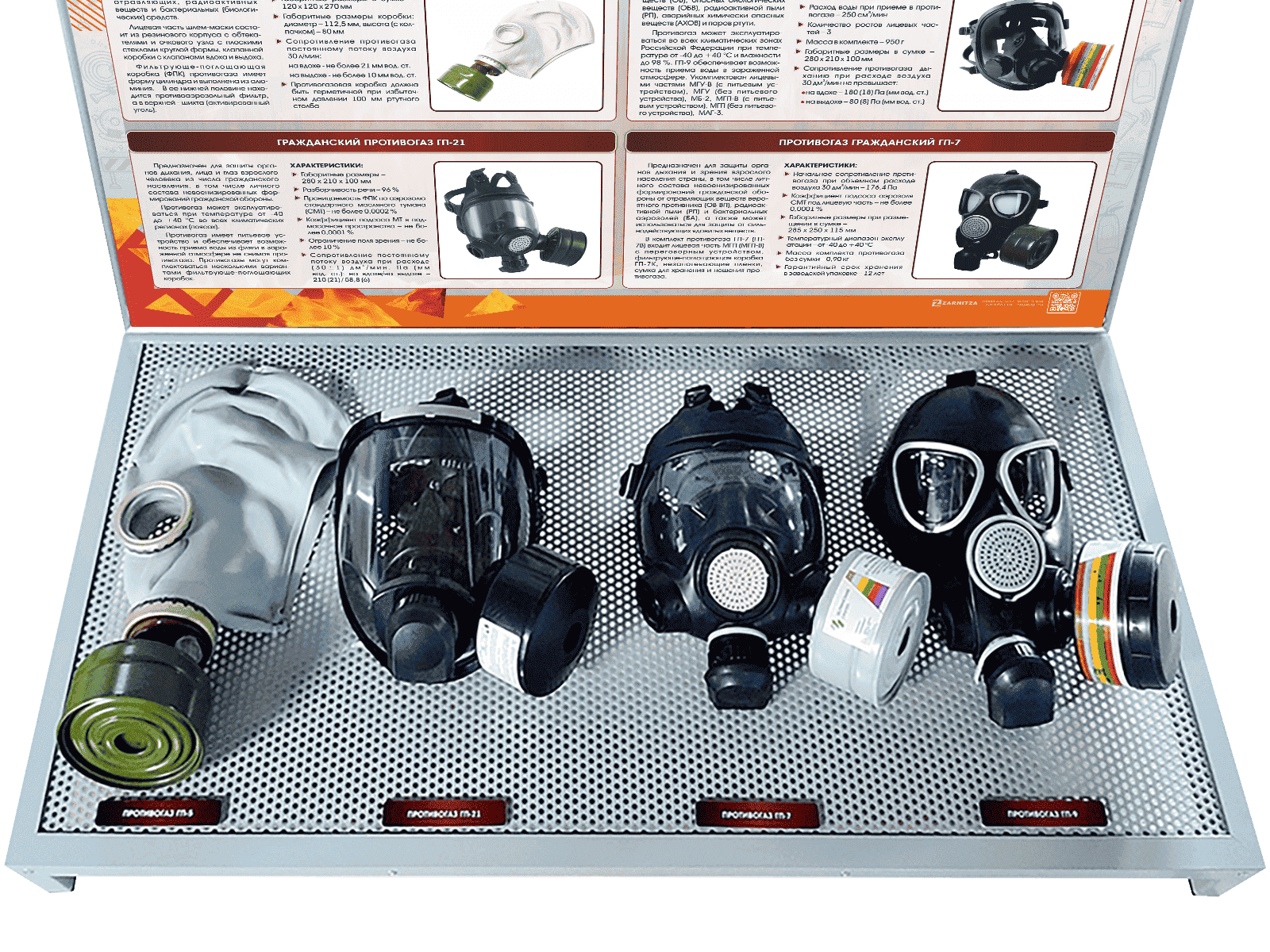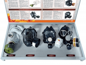 Демонстрационный стенд оснащен информационным панно, на котором представлена информация о существующих видах противогазов и их технических характеристиках.