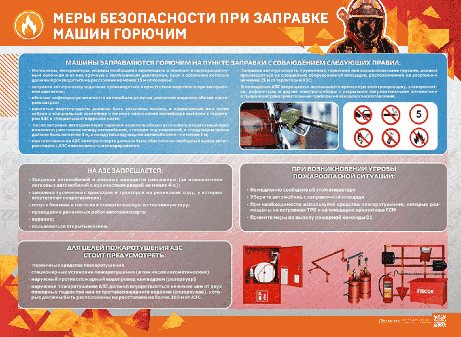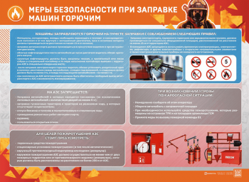 Стенд "Меры безопасности при заправке машин горючим" представляет собой панель, на которой размещена информация о правилах заправки машин горючим на АЗС, действиях при угрозе возникновения пожарной ситуации и средствах пожаротушения.