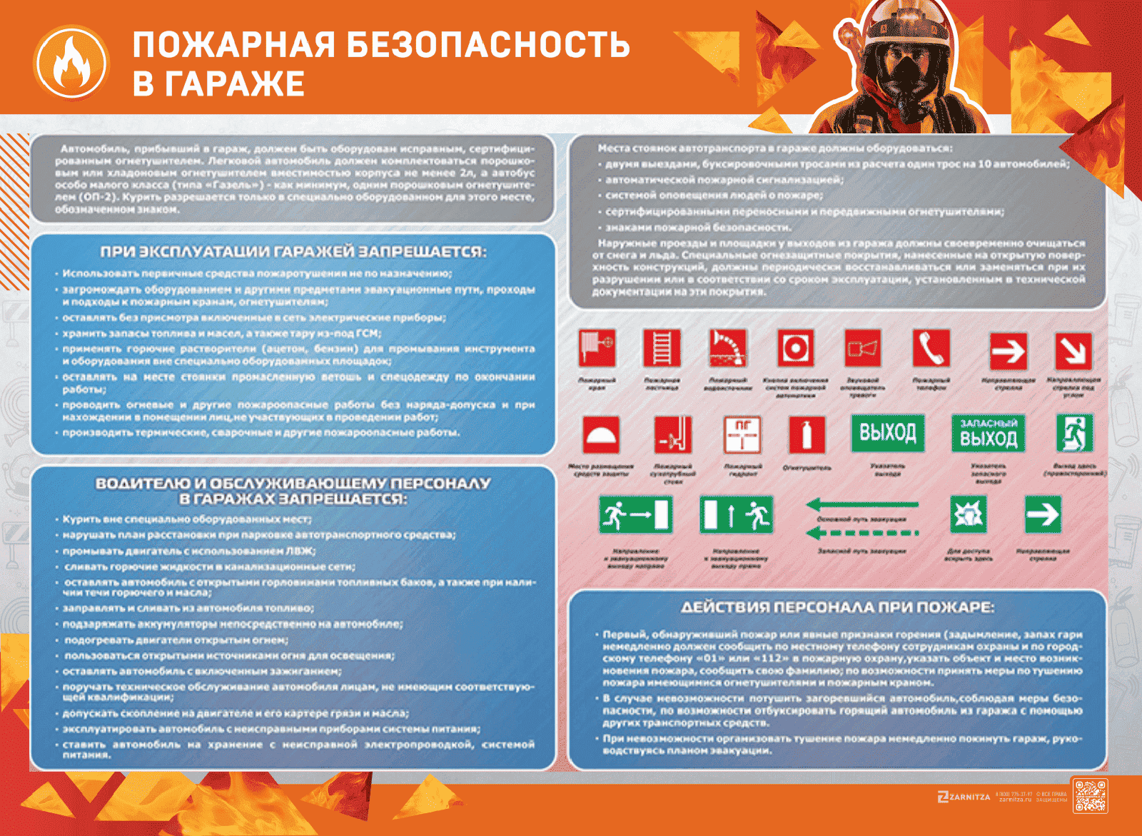 Стенд "Пожарная безопасность в гараже" представляет собой панель, на которой размещена информация о правилах пожарной безопасности при эксплуатации гаражей для водителей и обслуживающего персонала.