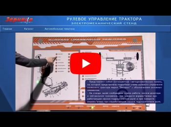 Электромеханический стенд "Рулевое управление трактора" представляет собой полноцветную светодинамическую панель, на которой представлена подробная схема рулевого управления колесного трактора марки "Беларус" с обозначением основных элементов. На стенде также изображены схемы работы насоса-дозатора в нейтральном положении, при повороте вправо/влево при работающем насосе гидроусилителя руля и при повороте вправо/влево при неработающем насосе гидроусилителя руля. В конструкцию учебного оборудования интегрированы высокочувствительные сенсоры для управления стендом при помощи интерактивного воздействия приемо-передающих устройств.