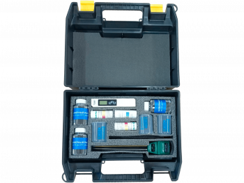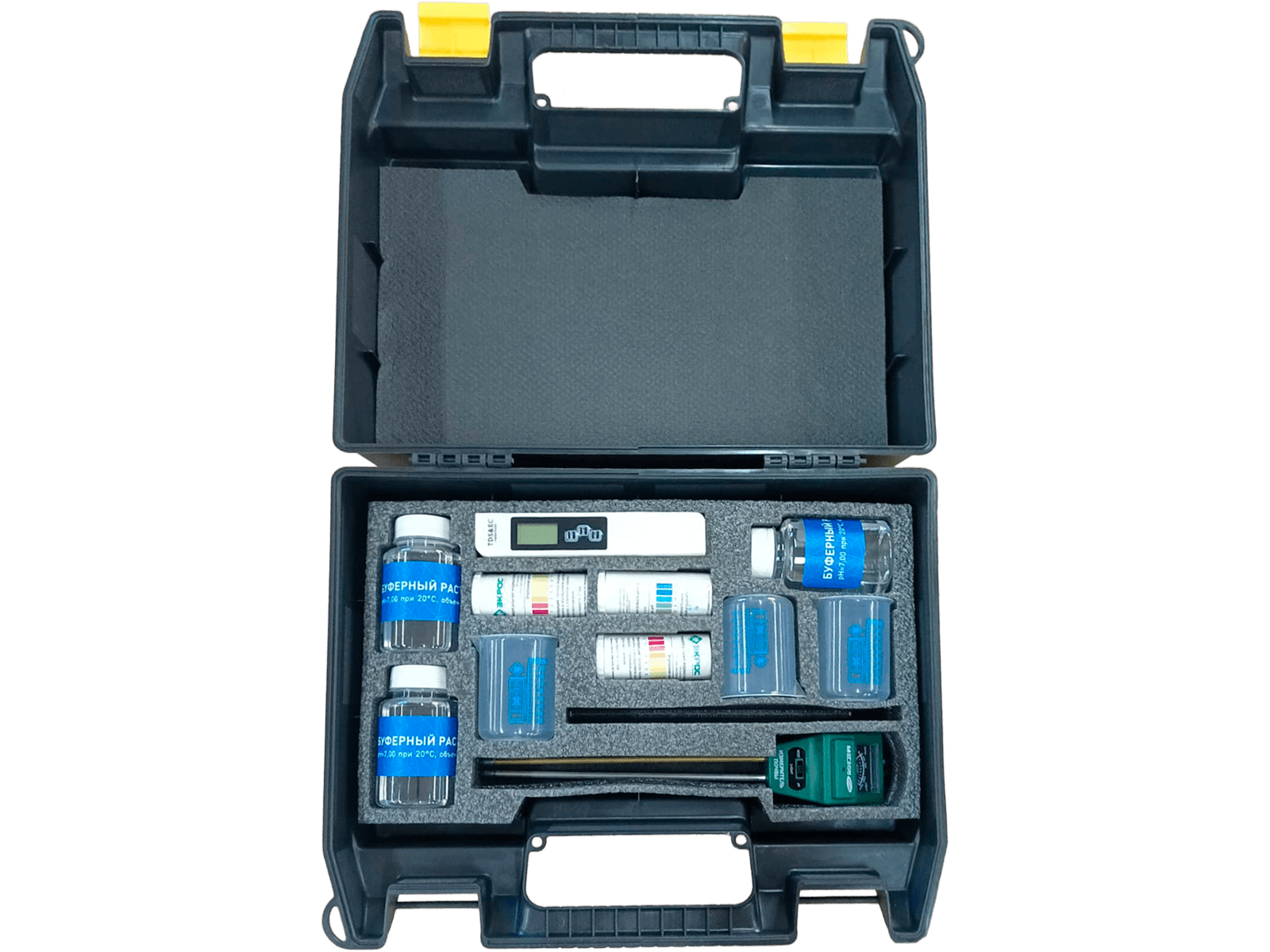 Комплект представляет собой транспортировочный кейс, содержащий учебные материалы и приборы для снятия показаний и определения свойств и качества почвы и воды.