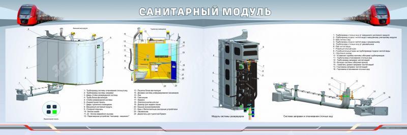 Стенд представляет собой полноцветную панель, на которой расположена информация по конструкции санитарного модуля, резервуарной системы, системы заправки и откачивания сточных вод.
