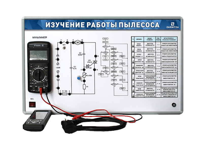 Комплект учебно-лабораторного оборудования "Изучение работы пылесоса" предназначен для проведения лабораторно-практических занятий по изучению принципиальной электрической схемы бытового пылесоса, поиску и локализации неисправностей в схеме управления пылесоса. В стенде предусмотрена возможность имитации неисправностей элементов схемы управления пылесоса.
