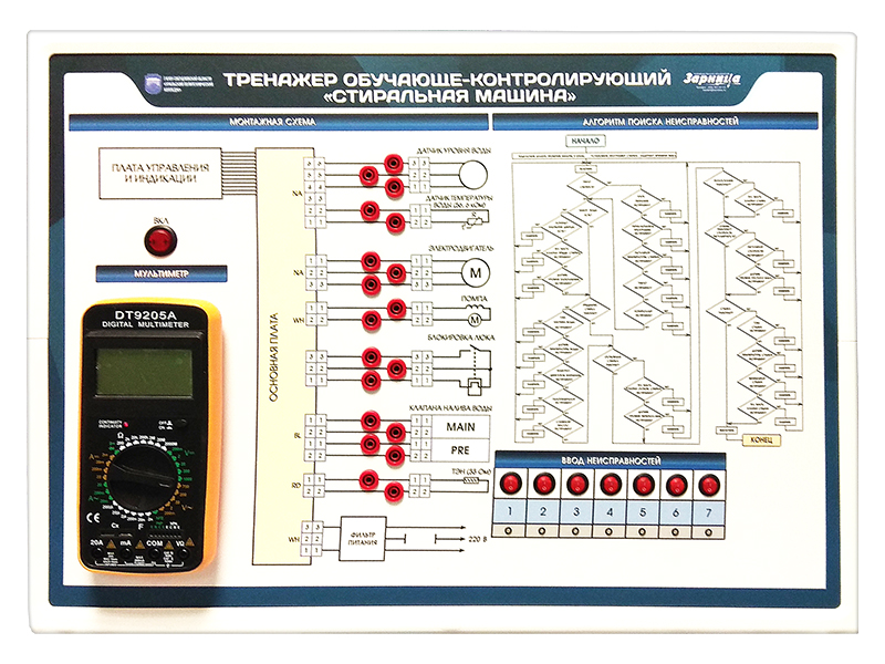 Оборудование напольного моноблочного исполнения включает действующую модель стиральной машины, оснащенную модулем ввода неисправностей и мультиметром. На лицевой панели модуля ввода неисправностей отображена принципиальная схема стиральной машины с контрольными гнездами, позволяющими с помощью мультиметра осуществить локализацию введенных неисправностей.