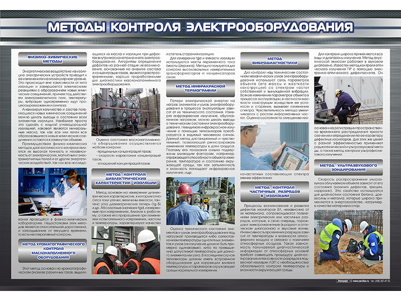 Стенд представляет собой информационную панель, на которой изображено описание основных методов контроля электрооборудования.