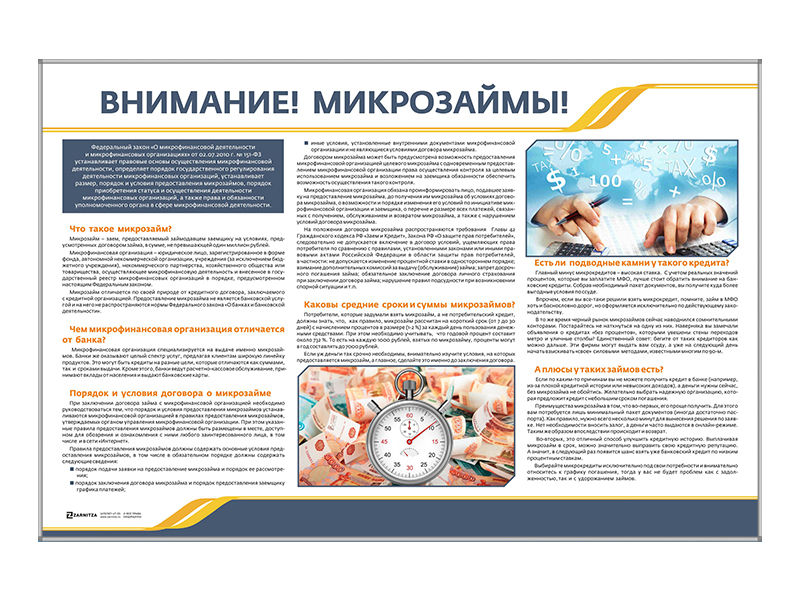 Стенд представляет собой полноцветную информационную панель, на которой размещена информация по микрозаймам и опасностями, с ними связанными.