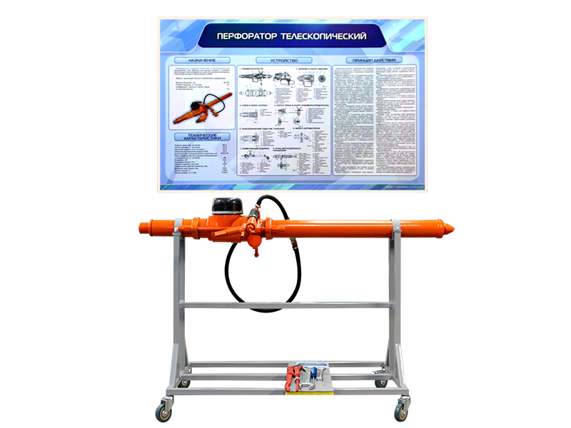 Тренажерный комплекс состоит из подвижного металлического основания, на котором закреплен реальный образец промышленно выпускаемого телескопического перфоратора, и стенда, на котором представлена информация о назначении, технических характеристиках, конструкции, принципе действия и последовательности операций по сборке/разборке телескопического перфоратора.