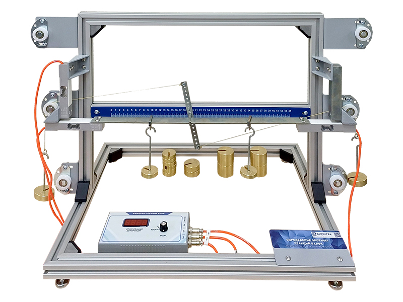 Комплект оборудования конструктивно представляет собой установленную на неподвижном основании вертикальную рамную конструкцию с закрепленной на раме системой подвижных блоков и роликов и подвешенных в системе на капроновые тросики подвесов с тарированными грузами.