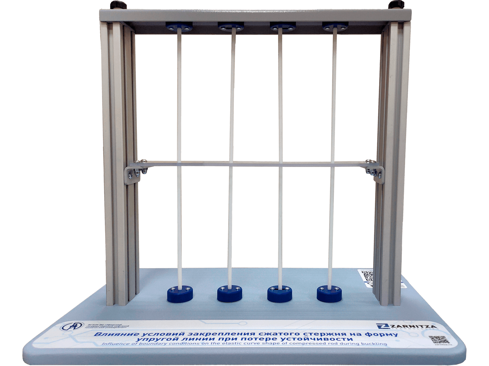 Лабораторная установка включает четыре гибких стержня с различным закреплением, обеспечивает демонстрацию явления потери устойчивости и показывает зависимость формы упругой линии от условий закрепления стержня. Может применяться в процессе обучения в учреждениях среднего и высшего профессионального образования для получения базовых и углубленных знаний и навыков по курсам "Прикладная механика" и "Сопротивление материалов".